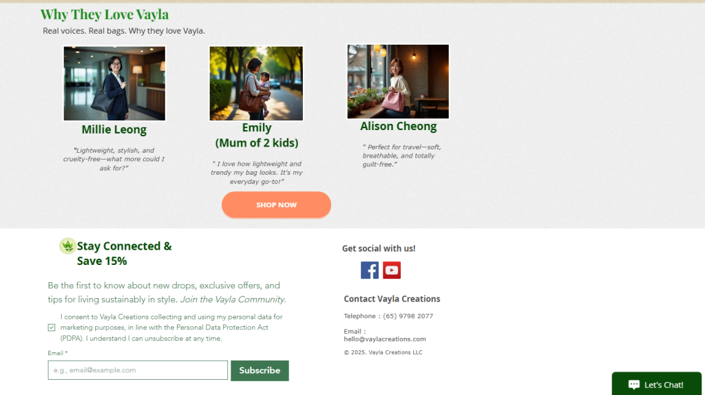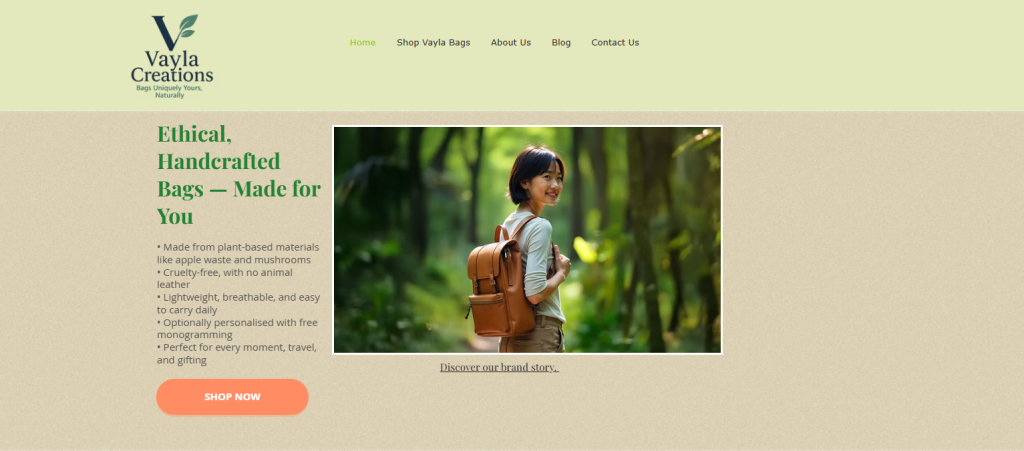 A clean, product-focused landing page designed to highlight the benefits of plant-based bags, featuring customer testimonials, with two clear call-to-action, and lead capture for community engagement. It also includes link to Vayla Brand video. View the landing page