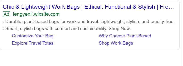 This ad emphasizes the stylish, durable, and cruelty-free nature of Vayla Creations’ plant-based work bags. Highlighting comfort, functionality, and sustainability, it showcases a clear message with direct shopping links — an example of targeted search ad design.